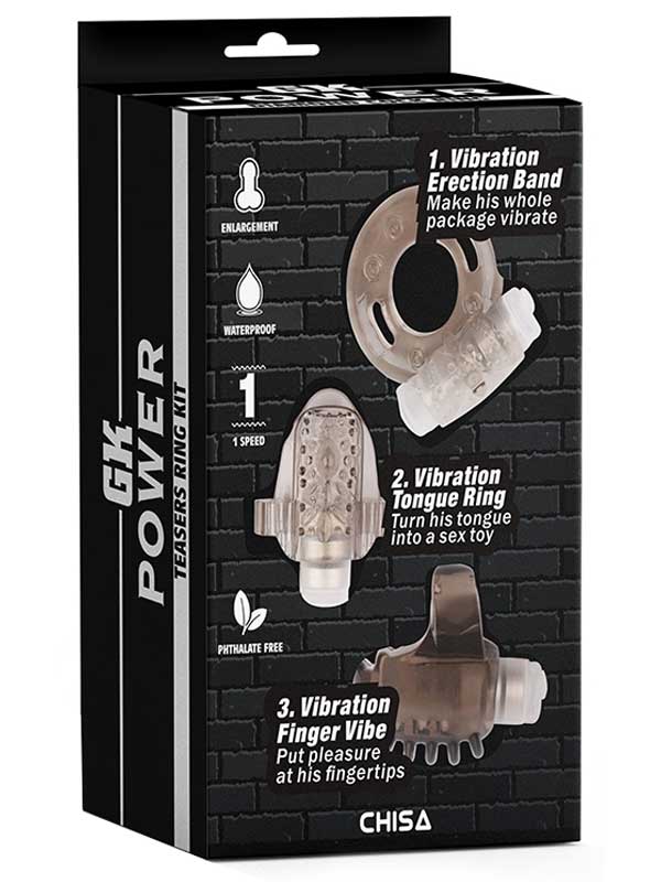 Chisa GK Power penis halkası ve setleri bir çok farklı amaç için üretilmektedir ve sevilerek tercih edilen ürünlerdir. Çok amaçlı bu set içerisinde dil, parmak ve penis halkaları mevcuttur. Yumuşak ve tırtıklı yapısı sayesinden kolay ve konforlu kullanım sağladığı gibi daha fazla uyarı da verir. Esnek yapısı sayesinde ise tüm kullanıcılara uygundur. Ayrıca pilleri değiştirebilir olduğundan piyasadaki benzeri halkalar gibi tek kullanım değil, tekrar tekrar kullanıma uygundur. Her biri 3 adet LR44 pil kullanır. Ürünlerin içinde pil vardır.