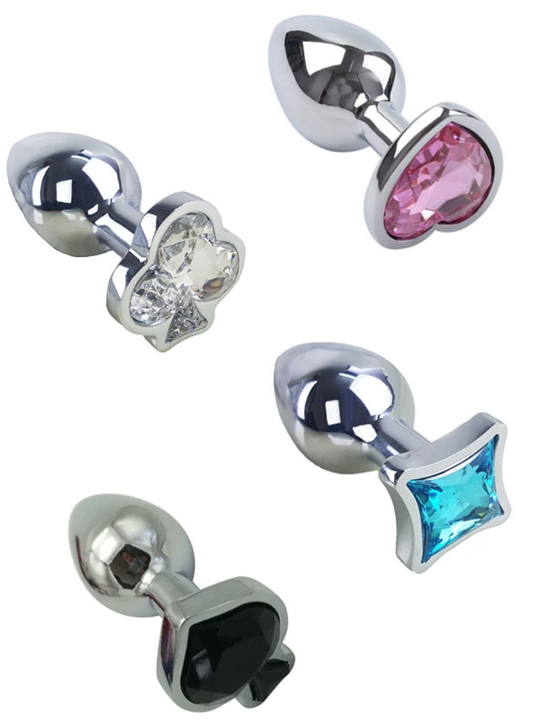 Alt kısmı değiştirilebilir 4 farklı modelde renkli kristal taşla süslü, 7 cm uzunluğunda ve 2.8 cm genişliğinde çelik anal plug.